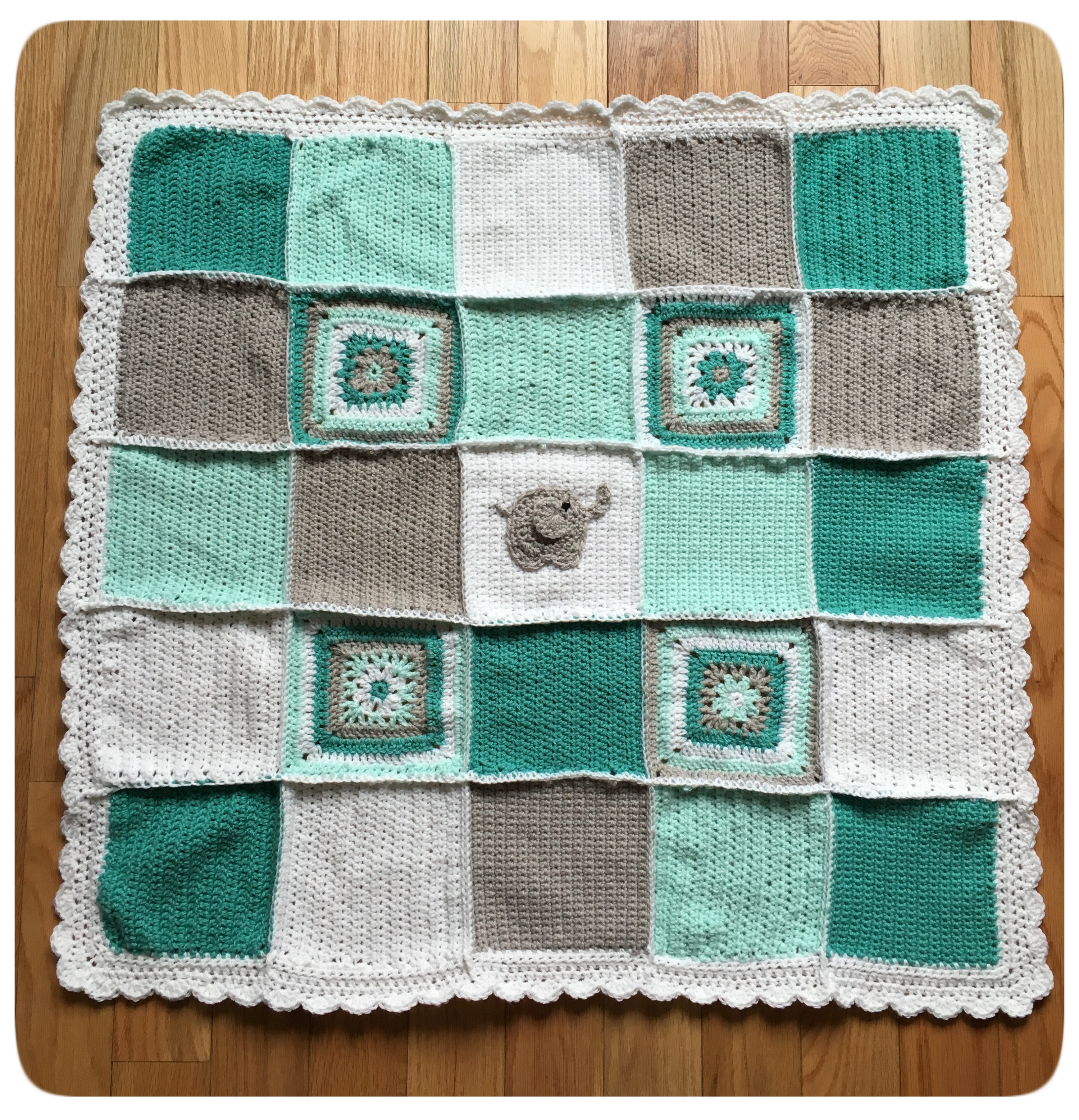 2016-02-15 Full Blanket Front with Border Published February 15, 2016 at 3000 × 3113 in Lucky Elephant Baby Blanket « Previous Next » Lucky Elephant Baby Blanket
